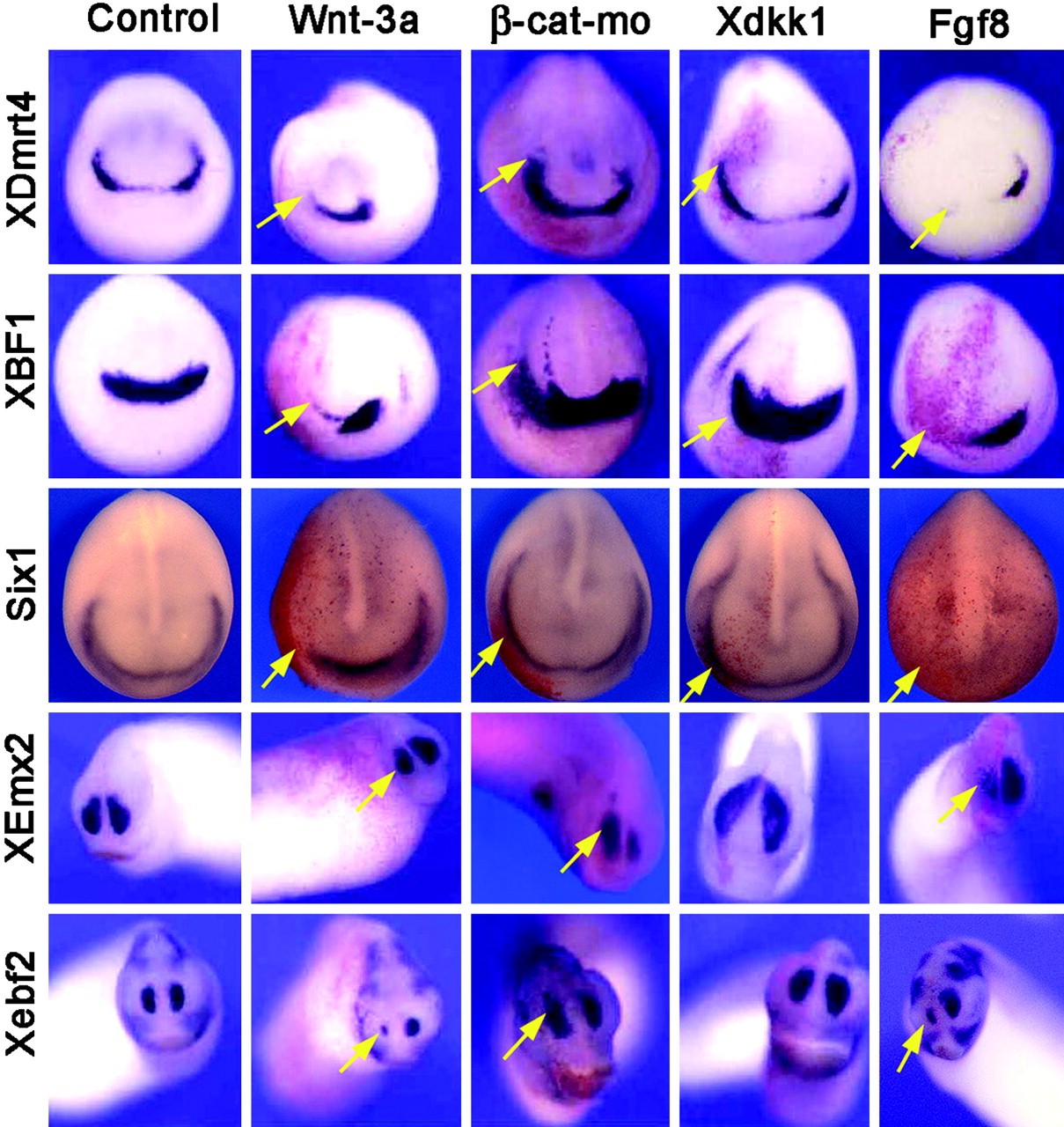 Fig. 3. Caudalizing factors restrict XDmrt4 expression domain. Activation of Wnt signaling pathway by injection of Wnt-3a blocks XDmrt4, XBF1, and Six1 expression at the neurula stage. Conversely, inhibition of Wnt signaling pathway by injection of β-catenin morpholino (β-cat-mo) or Xdkk1 mRNA expands posteriorly XDmrt4, XBF1, and Six1 placodal expression domains. At the tail bud stage, the same manipulations of the Wnt signaling pathway resulted in a reduction or an expansion of Xebf2 and XEmx2 expression in the nasal placode. In most cases, Xdkk1 injection leads to an expansion of these markers on both sides of the injected embryos presumably because of Xdkk1 protein diffusion. Overexpression of Fgf8 completely blocks XDmrt4, XBF1, and Six1 placodal expression at the neurula stage, as well as the nasal placode expression of Xebf2 and XEmx2 at the tail bud stage. Anterior views are shown, dorsal to the top. RNA encoding the lineage tracer β-gal was coinjected in all cases to identify the injected side (red staining, left, arrows). (Magnifications: Ã8.) |