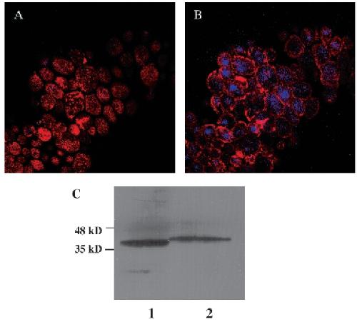 the nuclear DNA is blue (stained with DAPI). In A, the cell surfaces
