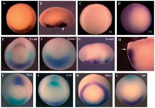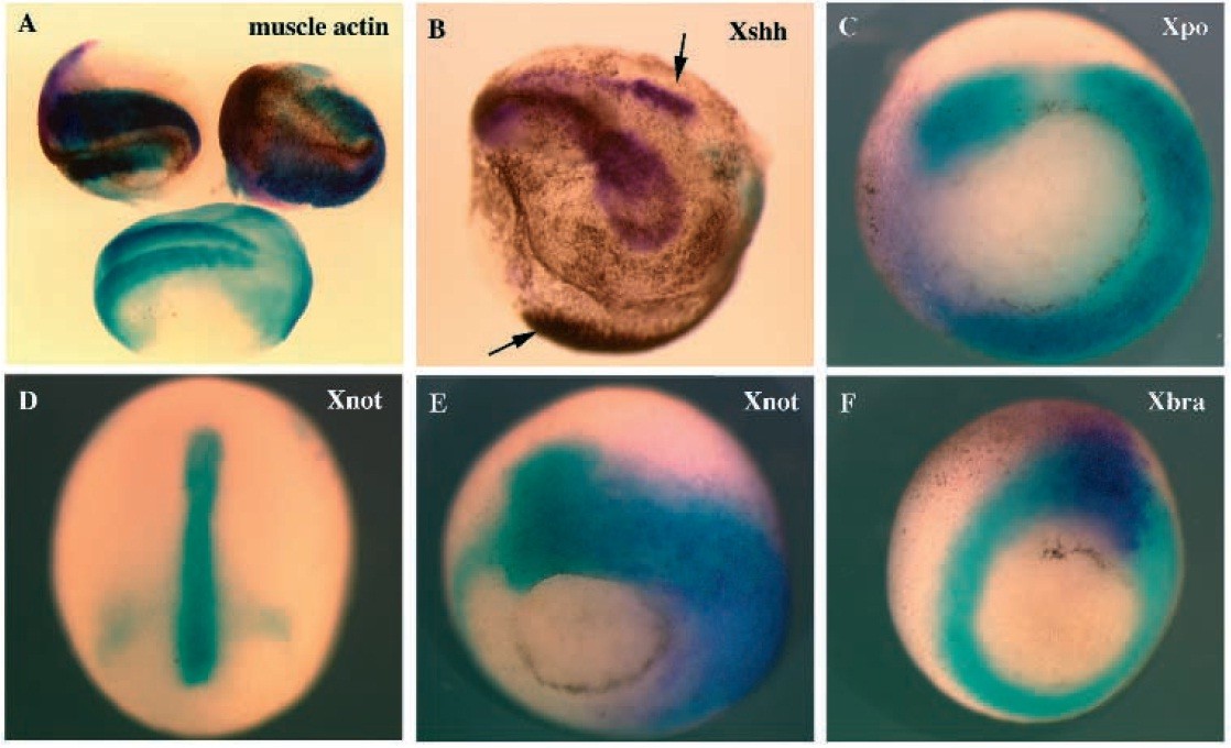 stage 11.5 embryos. (D) Xnot expression (blue) in a normal stage 12embryo and (E) in a szl-injected