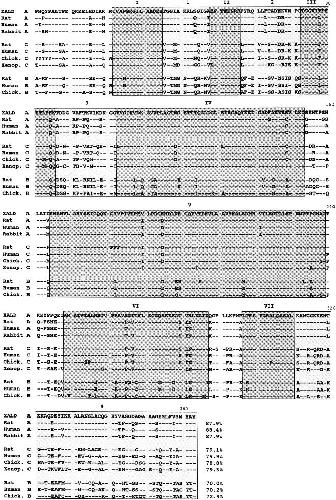 aldolases, the weakly shadowed regions 1–4. being the isozyme group-specific regions. Dashes are amino acid residues identical to those