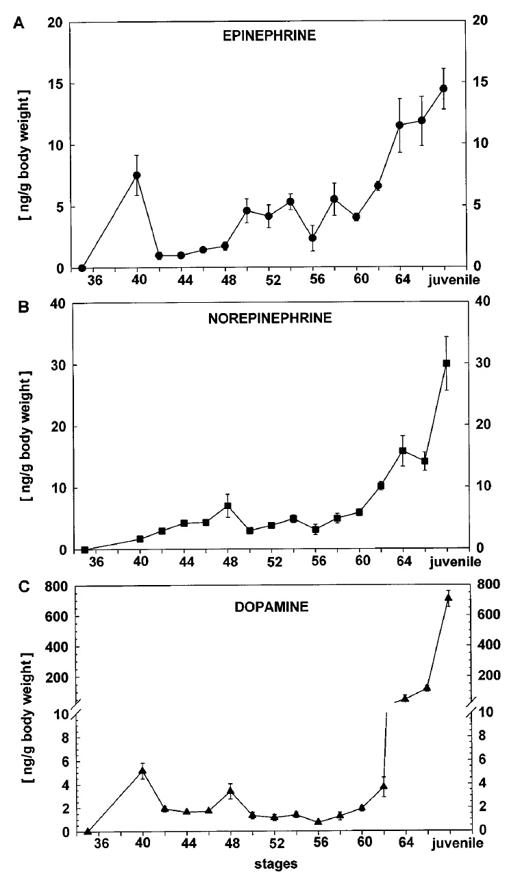 Changes in adrenal hormones during the complete developmental cycle from egg to juvenile were investigated in the amphibian Xenopus laevis. Whole-body concentrations of the adrenal steroids corticosterone (B), and aldosterone (Aldo) were determined by radioimmunoassay and those of the adrenal catecholamines epinephrine (E), norepinephrine (NE), and dopamine (D) were determined by HPLC. In addition, the catecholamine-synthesizing enzymes tyrosine hydroxylase, dopamine beta-hydroxylase, and phenylethanolamine N-methyltransferase were immunocytochemically localized for the characterization of chromaffin adrenal cells. B and Aldo were not detectable in the whole body before hatching. B levels rose earlier than Aldo levels from stage 36 onward. B had already peaked at stage 46, whereas the largest amounts of Aldo were found at stage 54. After peaking, both steroids decreased gradually to 2.7 +/- 0.62 (B) and 0.4 +/- 0.1 (Aldo) ng/g body wt (mean +/- SEM, n = 10) in juvenile animals. E, NE, and D were detected just after hatching, when E and D showed an early peak at stage 40. E and NE increased moderately during development and demonstrated a sharp increase at the end of metamorphosis from stages 62 onward to 14.4 +/- 1.7 (E) and 34.1 +/- 4.67 (NE) ng/g body wt (mean +/- SEM, n = 6). Interestingly, D levels had a distinct pattern, because concentrations of D remained lower than those of NE and E over nearly the complete development, but showed a dramatic rise during the latest stages, reaching 707 +/- 54 ng/g body wt in juveniles. This dramatic shift in catecholamine levels was confirmed by immunocytochemistry in parallel. A large increase in chromaffin cells labeled with tyrosine hydroxylase immunoreactivity occurred in the latest developmental stages. The catabolic rates for all catecholamines in vivo were similar, which indicates that the different levels are due to various rates of synthesis. Thus, adrenal corticosteroids as well as catecholamines may have regulatory effects during premetamorphosis and metamorphic climax.