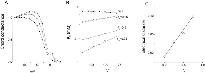 Figure 9. Cs+ blocking of WT and hybrid channels. (A) Representative I-V relationships for WT (•) and hybrid (fm = 0.5; ○) channels at different concentrations of Cs+. Currents for hybrid channels were scaled up to match the WT current at −100 mV in the absence of blocker. (B) Fractional currents at −140 mV as a function of Cs+ concentration. The curve represents fitting of the WT data to Eq. 1 with Kd = 13.7 ± 0.4 μM. 14.6 ± 0.26 μM for fm = 0.25, 15.03 ± 0.30 μM for fm = 0.5 and 17.24 ± 0.91 μM for fm = 0.75.(C) Voltage dependence of dissociation constants. A line represents fitting of WT data to Eq. 2 with Kd (0 mV) = 5.62 ± 0.75 mM and δ = 1.09 ± 0.03. Symbols are as in Fig. 2.