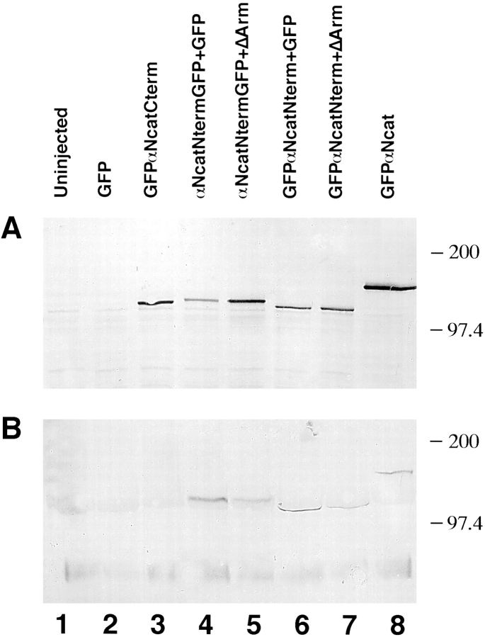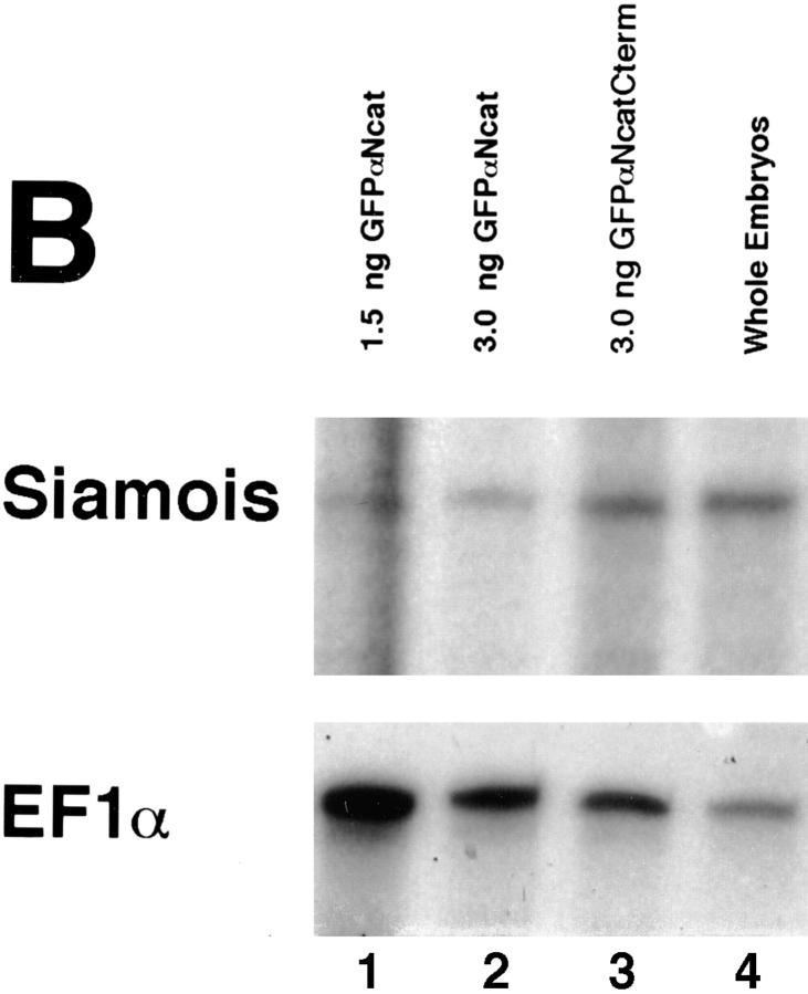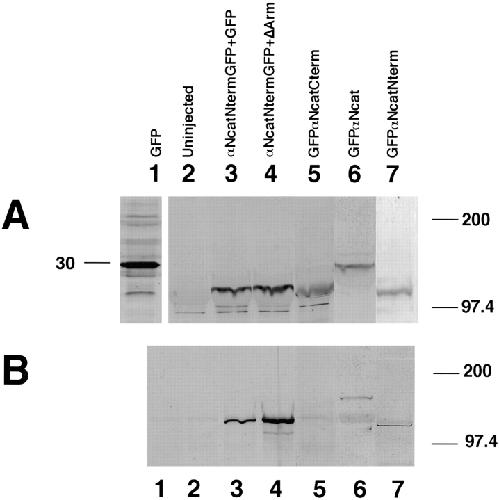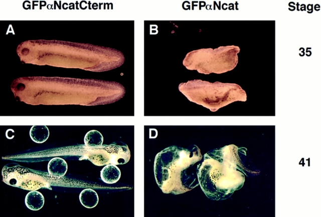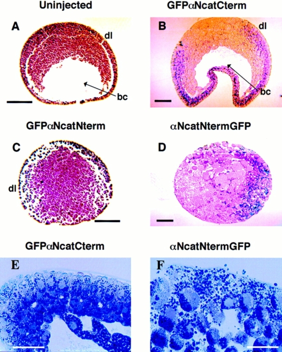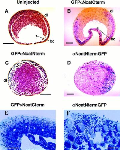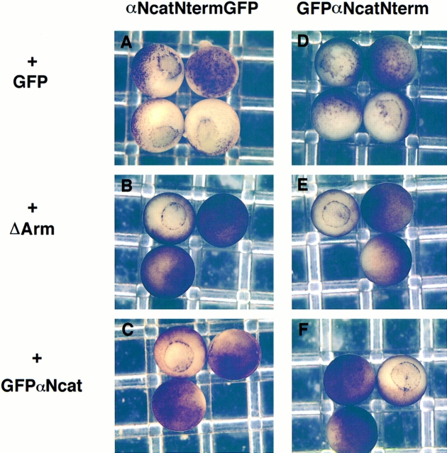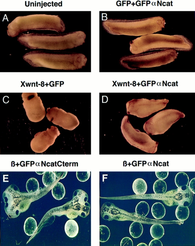 In Xenopus laevis development, beta-catenin plays an important role in the Wnt-signaling pathway by establishing the Nieuwkoop center, which in turn leads to specification of the dorsoventral axis. Cadherins are essential for embryonic morphogenesis since they mediate calcium-dependent cell-cell adhesion and can modulate beta-catenin signaling. alpha-catenin links beta-catenin to the actin-based cytoskeleton. To study the role of endogenous alpha-catenin in early development, we have made deletion mutants of alphaN-catenin. The binding domain of beta-catenin has been mapped to the NH2-terminal 210 amino acids of alphaN-catenin. Overexpression of mutants lacking the COOH-terminal 230 amino acids causes severe developmental defects that reflect impaired calcium-dependent blastomere adhesion. Lack of normal adhesive interactions results in a loss of the blastocoel in early embryos and ripping of the ectodermal layer during gastrulation. The phenotypes of the dominant-negative mutants can be rescued by coexpressing full-length alphaN-catenin or a mutant of beta-catenin that lacks the internal armadillo repeats. We next show that coexpression of alphaN-catenin antagonizes the dorsalizing effects of beta-catenin and Xwnt-8. This can be seen phenotypically, or by studying the effects of expression on the downstream homeobox gene Siamois. Thus, alpha-catenin is essential for proper morphogenesis of the embryo and may act as a regulator of the intracellular beta-catenin signaling pathway in vivo.