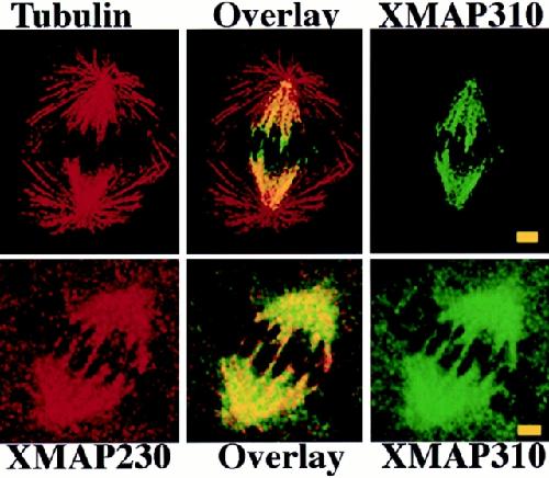 Figure 2. (Top) XMAP310 localization in the mitotic spindle: MTs stained with a rabbit anti-tublin pAb in the rhodamine channel (Tubulin), XMAP310 in the fluorescein channel (XMAP310) and in overlay (Overlay). (Bottom) XMAP230 and XMAP310 colocalize (Overlay) to the central region of the mitotic spindle in XL177 cells. Images were obtained by confocal microscopy. Bar, 2.5 μm.