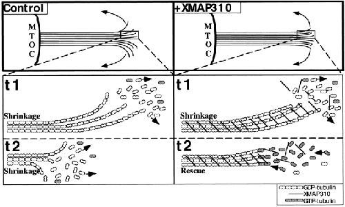 Figure 6. Model for how XMAP310 may promote rescues and MT cross-linking. (Top) Plane-projection of a depolymerizing (shrinking) MT in the absence (Control) or presence of XMAP310 (+XMAP310), with protofilaments (lines) peeling off the MT by out-wards curvature (arrows). Note the more blunt MT end in the presence of XMAP310 which could be promoted if cross-linking of protofilaments by XMAP310 prevents the outwards curvature of protofilaments. (Bottom) Magnifications of the boxed areas, showing part of the MTs at two different time points, t1 and t2. In the Control, the MT is shrinking both at t1 and t2, by loss of GDP-tubulin (arrows). In the presence of XMAP310 the MT is shrinking at t1. At t2 the MT has been rescued. A depolymerizing MT (t1) will meet resistance towards depolymerization due to the cross-linking of protofilaments/MTs, but XMAP310 does not dramatically prevent the loss of the tubulin dimers from the depolymerizing ends (little effect on vs). Eventually depolymerization of the MT is blocked long enough to maintain the depolymerizing MT-GDP-lattice in a straight conformation allowing new GTP-tubulin subunits to be added to the end, and the MT has been rescued (arrows indicate the direction of the flux of tubulin subunits).