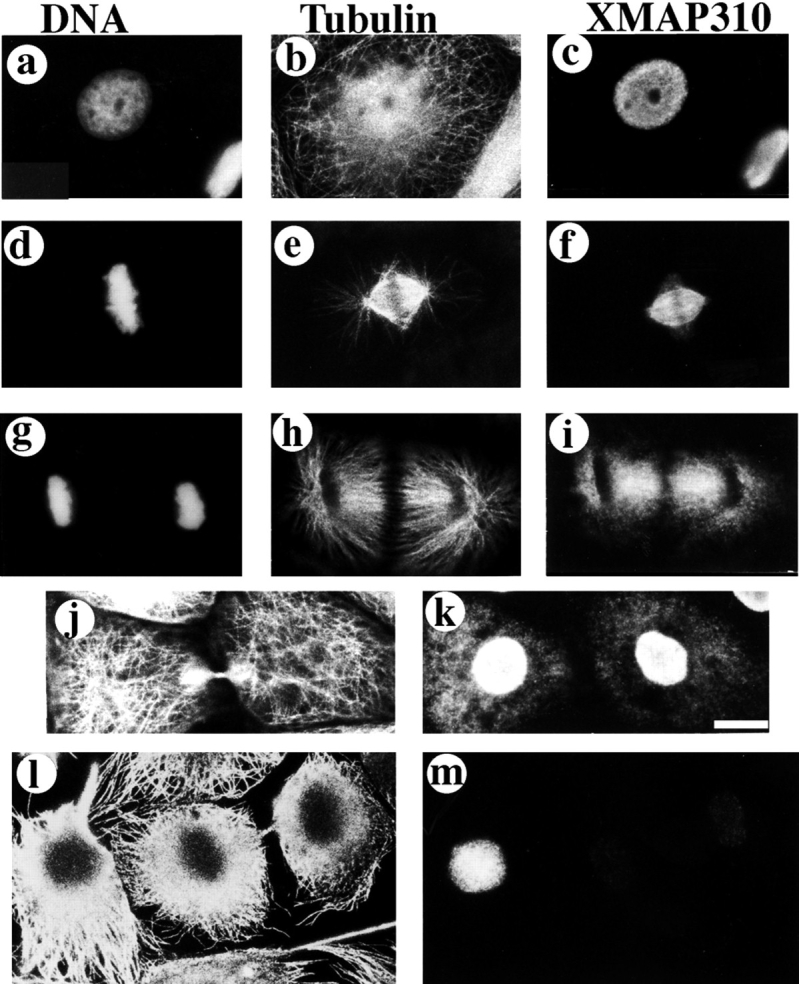 Figure 1. XMAP310 localization in XL177 cells (Miller and Daniel, 1977) during the cell cycle. XL177 cells were stained with: Hoechst (a, d, g), a rabbit anti-tubulin pAb (b, e, h, j, l), and the Q4 mAb (c, f, i, k, m). Interphase (a–c), metaphase/early anaphase after pr-extraction with 0.5% TX-100 (d–f), late anaphase (g–i), late telophase without preextraction (j and k), late telophase with preextraction (l and m). Bar: (a–k) 10 μm; (l and m) 12.5 μm.