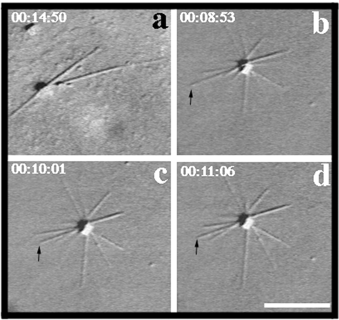 Figure 5. MT dynamics visualized by video microscopy. MTs are nucleated by a centrosome (center of the MT asters). (a) MTs polymerized in the absence of XMAP310. (b–d) MTs polymerized with XMAP310. The MT indicated with an arrow experienced a catastrophe shortly after the frame shown in b, and shrank to the length shown in c where it was rescued and continued to grow, as shown in d. Time since transfer to 37°C is indicated by xx:xx:xx, which represents hours:minutes:seconds, respectively. Bar, 10 μm.