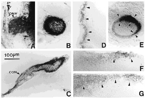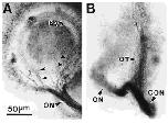 (ON) , which at this stage exits from ventralretina. (B) Staining of optic axons near the optic chiasm and optic