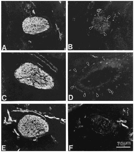 Unlabeled arrowheads in (B) and (D) point to the outer rim of the optic nerve. (E,F) Sections