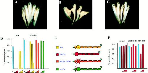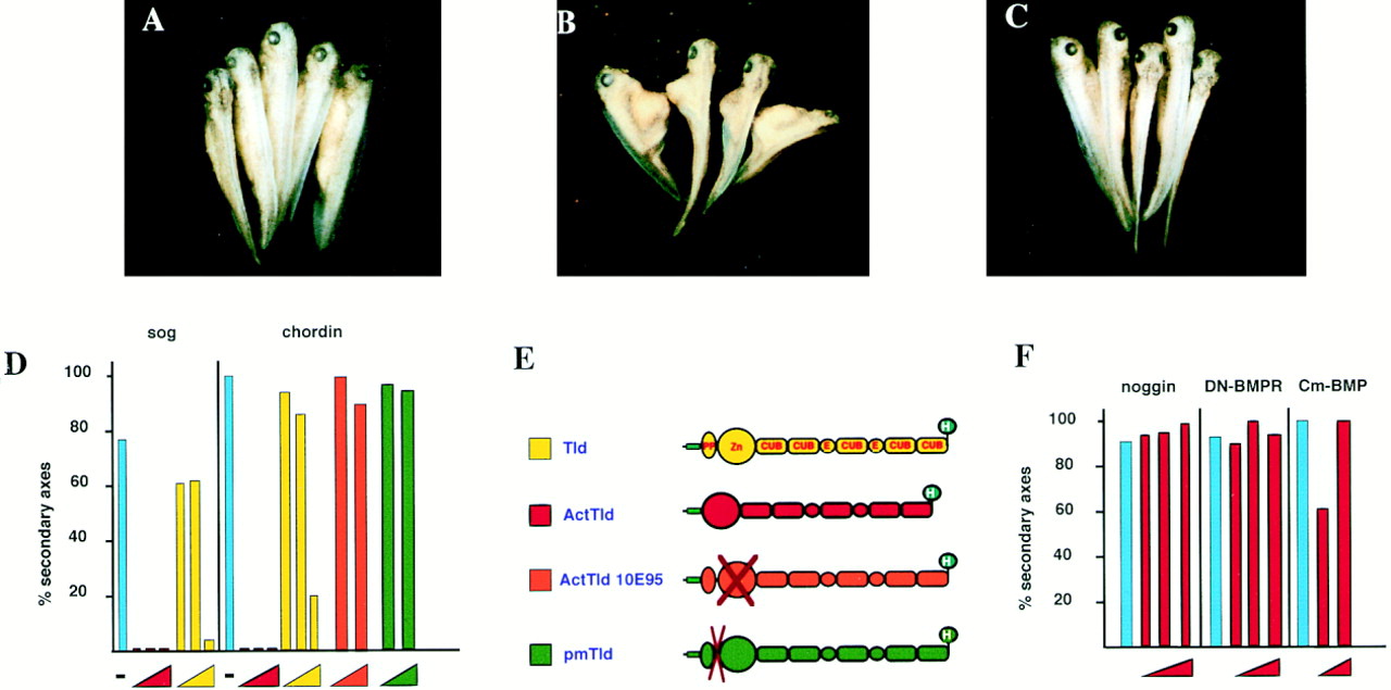 (F) Expression of activated TLD (0.4 ng, 1.5 ng, and 4.0 ng per embryo) does not block secondary axis formation mediated by noggin (100 pg), DN-BMPR (2 ng), and Cm-BMP4 (2 ng) mRNA injected.