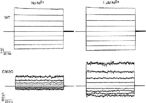 Figure 3. Ni2+ substantially increases the currents produced by saturating (4 mM) cGMP in E363G but not in wild-type channels. Currents are in response to families of voltage steps from a holding potential of 0 to between −80 and +80 mV in increments of +20 mV. Leak currents in the absence of cGMP have been subtracted.