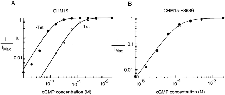 Figure 5. Tetracaine shifted the cGMP dose–response curve to the right in CHM15 but not CHM15-E363G channels. (A and B) cGMP dose–response curves in the absence and presence of 40 μM tetracaine for a patch containing CHM15 (A) or CHM15-E363G (B) channels. Currents in the absence of tetracaine are normalized by currents obtained in the presence of saturating (2 mM) cGMP. For comparison, currents in the presence of 40 μM tetracaine are normalized by currents obtained in the presence of saturating (2 mM) cGMP + 40 μM tetracaine. All currents were measured at +60 mV. Fits are to Eq. 1. For the CHM15 channel in the absence of tetracaine, K1/2cGMP = 15.6 μM, n = 2.1. For the CHM15 channel in the presence of 40 μM tetracaine, K1/2cGMP = 108.7 μM, n = 2.1. And for the CHM15-E363G channel both in the presence and absence of tetracaine, K1/2cGMP = 117.0 μM, n = 2.0.