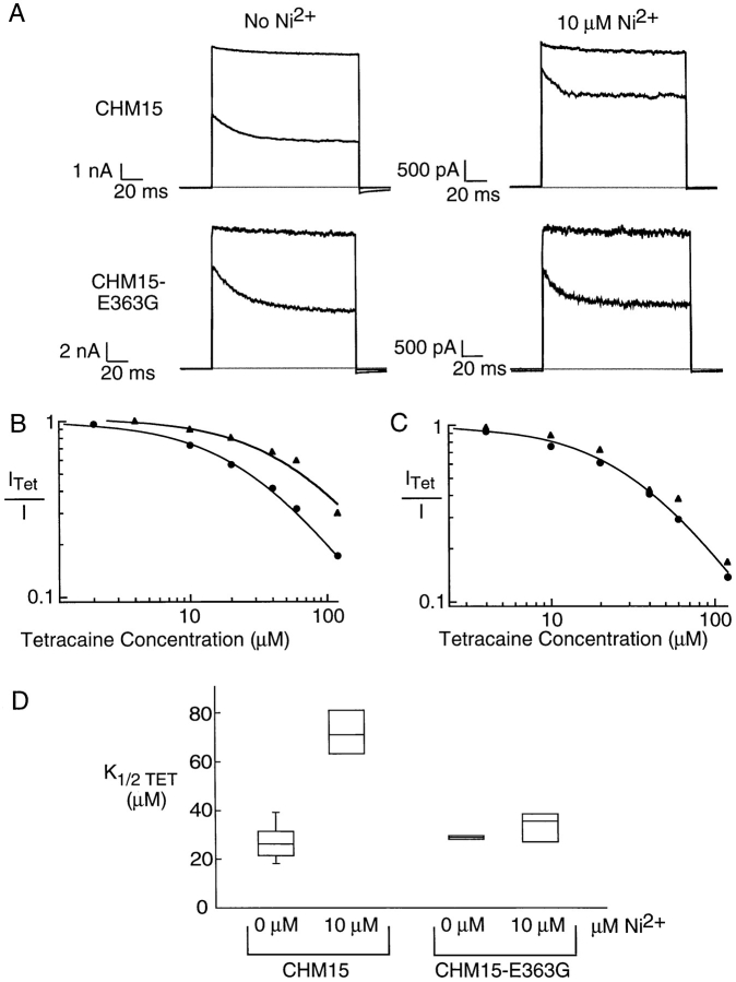 Figure 8. The E363G mutation in CHM15 eliminated Ni2+ relief of tetracaine block. (A) Block of CHM15 and CHM15-E363G channels in the absence and presence of Ni2+. Currents are in response to a voltage step to +60 mV from a holding potential of 0 mV for four separate patches. In each panel, the top trace shows current in the absence of tetracaine and the bottom trace shows current in the presence of 40 μM tetracaine. The shaded line represents the zero current level. (B) Dose–response curves for tetracaine from two separate patches containing CHM15 channels in the presence of 0 (•) or 10 (▴) μM Ni2+. All currents were measured at +60 mV. All currents were recorded in the presence of saturating (2 mM) cGMP and normalized by currents recorded in the absence of tetracaine. Fits are to Eq. 2. For 0 μM Ni2+: K1/2Tet = 26.5 μM, n = 1.0; for 10 μM Ni2+: K1/2Tet = 59.4 μM, n = 1.0. (C) Dose–response curves for tetracaine for two separate patches recorded from CHM15-E363G channels in the presence of 0 (•) or 10 (▴) μM Ni2+. The fit is to Eq. 2 with K1/2Tet = 31.0 μM, n = 1.3. (D) Box plot showing range of tetracaine-apparent affinities for CHM15 and CHM15-E363G channels in 0 and 10 μM Ni2+. The line in the middle of the boxes shows the median. The top and bottom edges of the boxes show the 25th and 75th percentiles of the data. The whiskers coming out of some of the boxes show the 5th and 95th percentiles.