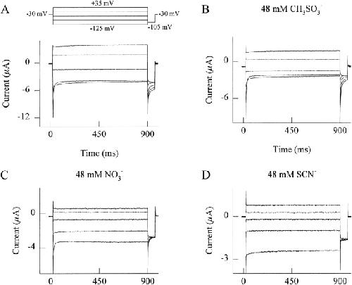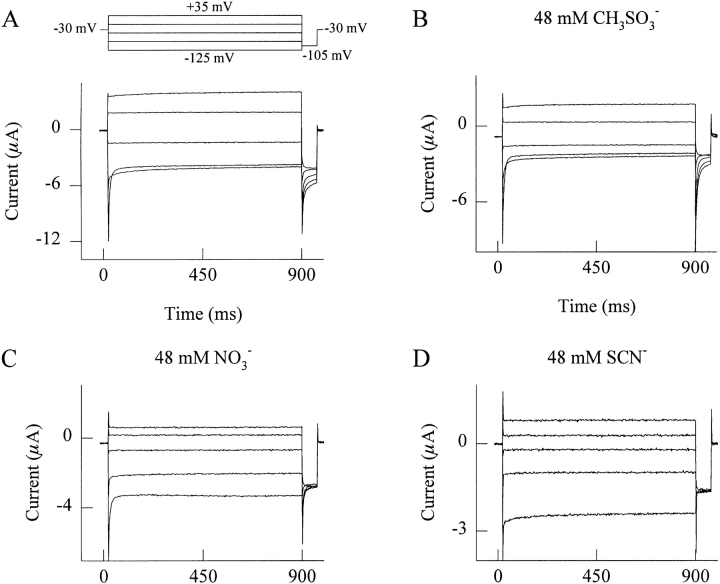 Figure 2. Effect of other extracellular anions on hClC-1 expressed in Xenopus oocytes. Current responses to voltage steps between −125 and +35 mV in 40-mV steps from a holding potential of −30 mV from a single oocyte are shown. In A, the extracellular solution was ND-96. For the three other recordings, 48 mM NaCl was substituted by an equimolar concentration of NaCH3SO3 (B), NaNO3 (C), and NaSCN (D). |