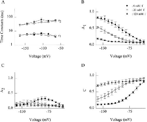 Figure 4. Effect of extracellular I− on hClC-1 deactivation. (A) Voltage dependence of fast and slow time constants in the absence (filled symbols) or presence (open symbols) of 40 mM I−. (B–D) Voltage dependence of the fractional amplitudes A1 (B), A2 (C), and C (D) determined in the presence of three different extracellular I− concentrations. Extracellular [I−] was increased by replacing NaCl with equimolar amounts of NaI in the external solution. Each point represents mean ± SEM for at least three cells. |