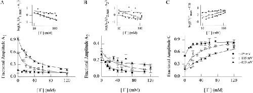 Figure 5. Relationship between extracellular I− concentration and fractional current amplitudes. Fractional current amplitudes were determined at three different test potentials (−75, −115, and −165 mV) as described in methods. Solid lines represent fitted hyperbola (see text) to the measured data. Each point represents mean ± SEM for at least three cells. (A) Fast deactivating fractional current amplitude, A1. (B) Slow deactivating fractional current amplitude, A2. (C) Nondeactivating fractional current amplitude, C. Insets show transformations of the data with fitted regression lines as described in results. Hill coefficients determined from the regression lines are as follows: A1: 0.47, 0.96, and 1.00; A2: 0.59, 0.98, and 0.22; C: 0.31, 0.86, and 0.99 for test potentials of −75, −115, and −155 mV, respectively. |