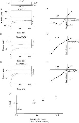 Figure 9. Effect of different intracellular anions on hClC-1 stably expressed in HEK-293 cells. (A, C, and E) Current responses to voltage steps from a holding potential of 0 mV to test potentials between −165 and +75 mV in 80-mV steps. Each step is followed by a test potential of −85 mV. Cells were bathed in standard extracellular solution and perfused intracellularly with a solution containing (mM): 50 NaCl, 50 NaX, 30 Na-gluco-nate, 2 MgCl2, 5 EGTA, 10 HEPES where X denotes I− (A), NO3− (C), or SCN− (E). (B, D, and F) Voltage dependence of the instantaneous current amplitudes from recordings shown in A, C, and E. (G) Correlation of the potency to block Cl− currents from the intracellular site and the fast deactivation time constant τ1 measured at a test potential of −145 mV. We defined a blocking parameter by dividing the current amplitude measured at +55 mV (which is not affected by intracellular anions) by the amplitude at −145 mV for each cell. Data points represent mean ± SEM from three cells. |