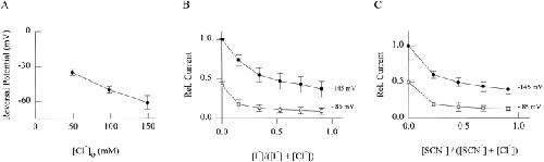 Figure 12. Concentration dependence of the reversal potential and mole fraction behavior in hClC-1. (A) Dependence of the reversal potential on extracellular Cl− concentration measured in HEK-293 cells. Current reversal potentials were measured under biionic conditions with I− as the only permeant intracellular and Cl− as the only permeant extracellular anion. Iodide and Cl− concentrations were changed proportionally. (B and C) Mole fraction behavior of hClC-1 instantaneous current amplitudes measured in Xenopus oocytes at −145 and −85 mV for mixtures of Cl− and I− (B), and Cl− and SCN− (C). Instantaneous current amplitudes were measured on three different cells For each oocyte, five different mole fractions were tested. The mole fraction was changed by replacing equimolar amounts of NaCl with either NaI or NaSCN. Relative current was calculated by normalizing instantaneous current amplitudes to the value obtained at −145 mV measured in ND-96 solution. |