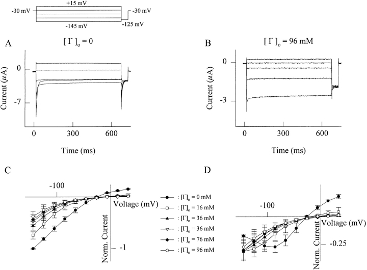 Figure 1. Effect of extracellular I− on hClC-1 expressed in Xenopus oocytes. (A) Current responses to voltage steps from a holding potential of −30 mV in 40-mV steps from −145 to +15 mV measured in standard extracellular solution. Each test pulse is followed by a step to −125 mV. (B) Current responses to the same pulse protocol in the same oocyte as in A after substitution of 96 mM NaCl by an equimolar concentration of NaI. (C) Voltage dependence of the instantaneous current amplitude for different extracellular [I−]. Data represent mean ± SEM from four different cells (every cell was tested with each [I−]). Current amplitudes were normalized to the instantaneous current amplitude measured at −145 mV in the absence of extracellular I−. (D) Voltage dependence of the late current amplitude obtained from the same data set shown in C. Data were normalized in the same way as in C. |