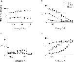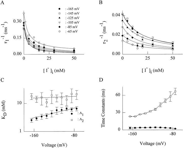 Figure 11. Intracellular I− concentration dependence of hClC-1 deactivation. Reciprocal deactivation time constants determined at six different test potentials in the presence of different intra-cellular I− concentrations. (A) I− concentration dependence of the fast deactivation time constant (τ1). (B) I− concentration dependence of the slow deactivation time constant (τ2). In A and B, solid lines represent fitted hyperbola to the measured data (see text), and each point represents mean ± SEM for at least three cells. (C) Voltage dependence of KD determined from data fits shown in A and B. (•) Fast deactivating state, (□) slow deactivating state. Lines indicate Woodhull fits: KD = KD(0 mV) eFδV/RT, where KD(0 mV) denotes the estimated value at a membrane potential of 0 mV and δ the electrical distance measured from the extracellular side of the membrane. (D) Voltage dependence of τmin for the derived values for fast (τ1, •) and slow (τ2, □) deactivation time constants. |