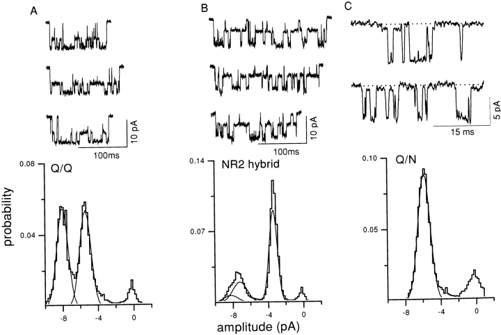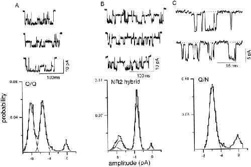 Figure 3. Three cluster patterns are produced upon expression of a mixture of NR2 plus mutant NR1 subunits. Each panel shows example clusters and the amplitude histogram of all clusters from a single patch. (A) The Q/Q pattern (main = −8.0 pA, sub = −5.4 pA; see Fig. 1 B). (B) A novel pattern (NR2 hybrid) with three open channel levels (−8.3, −7.0, and −3.4 pA). This pattern was never observed in receptors with purely mutant or wild-type subunits and, therefore, arises from a hybrid receptor that has both N and Q NR2B subunits. (C) The Q/N pattern (main = −5.9 pA, sub = −0.8 pA; see Fig. 1 D). To show the sublevel more clearly, a dashed line marks the baseline, and the example traces showing of this pattern were taken from continuous recordings. |