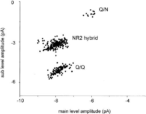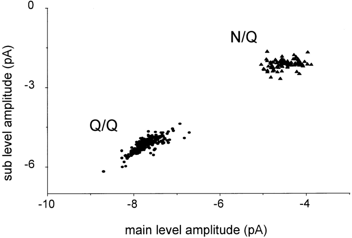 Figure 2. Cluster sub- versus main level amplitudes for Q/Q and N/Q receptor compositions. Oocytes were injected with either mutant NR1 plus mutant NR2 (Q/Q receptors; •, five patches), or wild-type NR1 plus mutant NR2 (N/Q receptors; ▴, three patches). All valid clusters in all of the patches are plotted. A single pattern of current is present with these injections of unmixed subunits. The diagonal distribution of Q/Q amplitudes indicates that scatter in the main and sublevels is correlated. |