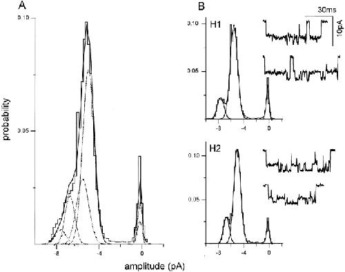 Figure 6. Six homogeneous cluster patterns are apparent upon expression of a mixture of NR1 plus mutant NR2 subunits. Each panel is from one patch in which one pattern predominated. The amplitude histograms pertain to all clusters in the patch; i.e., with no separation according to pattern. (A) The Q/Q pattern (see Fig. 1 B; n = 98 clusters). (B) Hybrid receptor pattern H1, with a main and sublevel similar to the Q/Q pattern but with a much higher relative occupancy in the sublevel (n = 44 clusters). (C) Hybrid receptor pattern H2, with a main level amplitude ∼15% lower than the Q/Q main level and with a preferential occupancy of the sublevel (n = 110 clusters). (D) Hybrid receptor pattern H3, with a main level amplitude ∼30% lower than the Q/Q main level, and nearly equal main and sublevel occupancies (n = 14 clusters). (E) Hybrid receptor pattern H4, with a main level of ∼40% lower than the Q/Q pattern, and a preferential occupancy of the sublevel (n = 13 clusters). (F) The N/Q pattern (see Fig. 1 C; n = 165 clusters). The amplitude, standard deviation, occupancy, and lifetime of the main and sublevel of each of these patterns is given in Table III. |