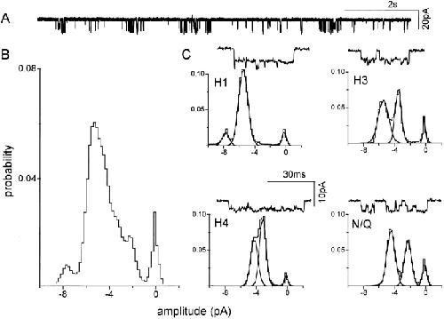 Figure 9. Separation of clusters by pattern: a mixed NR1 subunit patch with four patterns. The oocyte was injected with a 1:1 mixture of wild-type and mu-tant NR1 subunits, plus pure mutant NR2 subunits, and the outside-out patch was superfused with 20 μM NMDA plus pure 10-μM glycine in divalent-cation-free solution. Clusters with the H1, H3, H4, and N/Q patterns were apparent and were separated using a log likelihood criterion. (A) Continuous 10-s trace at low time resolution. (B) Amplitude histogram from all 444 clusters in the patch, before separation. Only the baseline, and a component at −7.8 pA, are distinct peaks. (C) Amplitude histograms of clusters after separation by pattern. (top left) H1 clusters (n = 154), (top right) H3 clusters (n = 48), (bottom left) H4 clusters (n = 34), (bottom right) N/Q clusters (n = 164). Rejected clusters (n = 44) are not shown. For examples of homogeneous H1, H3, H4, and N/Q patterns see Fig. 6. |