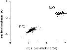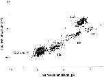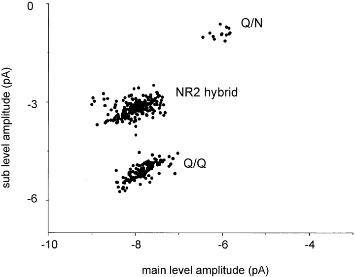Figure 5. Cluster sub- versus main level amplitudes for mixed NR2 subunit expression. Oocytes were injected with a mixture of wild-type and mutant NR2, plus pure mutant NR1 subunit RNAs. All valid clusters from 10 patches are plotted, irrespective of their classification according to pattern. Three groups are apparent. The bottom group is Q/Q receptors (see Fig. 2). The central group is NR2 hybrid receptors, composed of both wild-type and mutant NR2 subunits. There are three open channel current levels in this pattern; here, the smallest amplitude is plotted as a function of the largest amplitude. The top group is Q/N receptors. The number of clusters in this group is relatively small because during the automated analysis of clusters the sublevel was often not detected. |
