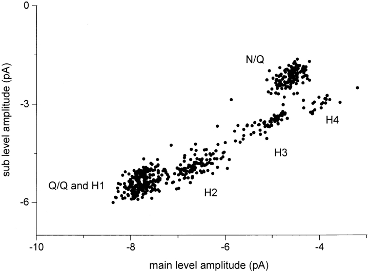 Figure 10. Cluster sub- versus main level amplitudes for mixed NR1 subunit expression. Oocytes were injected with a mixture of wild-type and mutant NR1, plus pure mutant NR2 subunit RNAs. All valid clusters from 10 patches are plotted, irrespective of their classification by pattern. Five groups, from six patterns, are apparent. The group at the lower left is Q/Q plus H1 receptors. The topmost group is N/Q receptors. The hybrid receptor groups (H1, H2, H3, and H4) fall along a diagonal that reflects the 1.4 main/sublevel amplitude ratio. Although there is significant scatter with each group, each population can be distinguished from its neighbors. The properties of these clusters is given in Table III; example clusters and amplitude histograms of each pattern are shown in Fig. 6. |