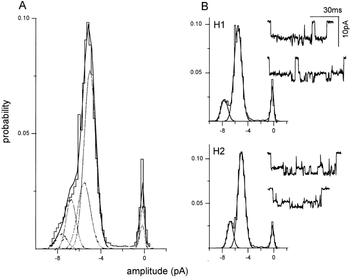 Figure 7. Separation of clusters by pattern: a mixed NR1 subunit patch with two patterns. The oocyte was injected with a 1:1 mixture of wild-type and mutant NR1 subunits, plus pure mutant NR2 subunits. Clusters with the H1 and H2 patterns were apparent, and were separated using a log likelihood criterion. (A) Amplitude histogram of all 94 clusters in the patch, before separation. (B) Amplitude histograms of clusters after separation. (top) H1 clusters (n = 38; main = −7.8 pA, sub = −5.6 pA; see Fig. 6 B). (bottom) H2 clusters (n = 56; main = −6.8 pA, sub = −4.9 pA; see Fig. 6 C). Three clusters were rejected because of a low likelihood (not shown). When summed, the Gaussian components of the separated histograms (A, dotted lines) plus the rejected clusters equals the combined histogram. For examples of homogeneous H1 and H2 patterns see Fig. 6. |