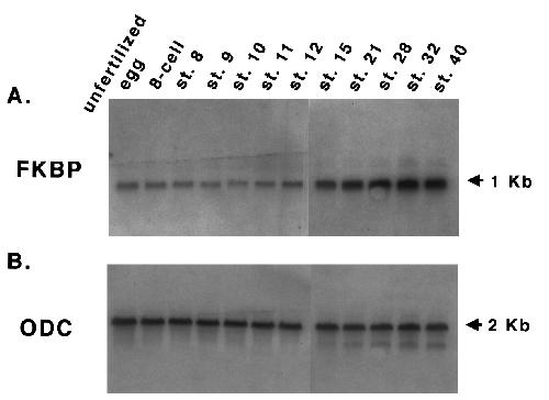 FIG. 2. Expression of FKBP mRNA in embryos. (A) Northern blot of FKBP. 20 mg of total RNA were used for each lane. (B) Expression