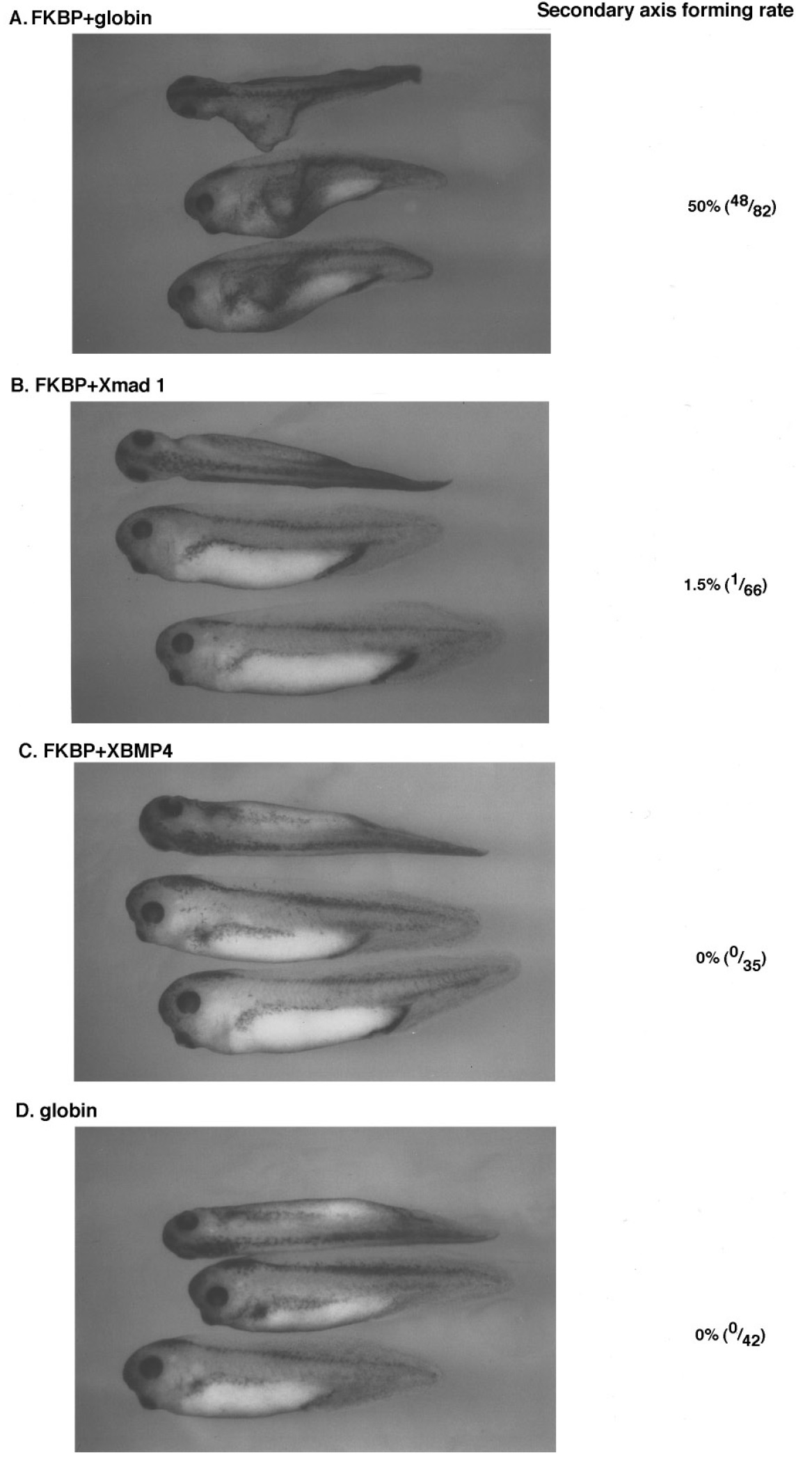 (C) Coinjection of FKBP mRNA ( 1 ng) with XBMP 4 mRNA ( 100 pg). The secondary axis formation was blocked in all embryos. (D)