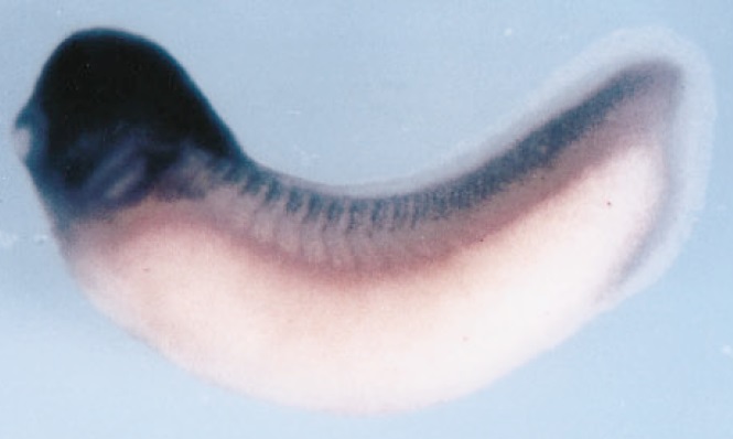 FIG. 3. Whole mount in situ hybridization analysis of FKBP mRNA in stage 18 (A) , 28 (B) and 31 (C) embryos.