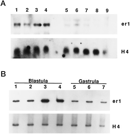 We have utilized the polymerase chain reaction (PCR)-based differential display methodology (Liang, P., and Pardee, A. B. (1992) Science 257, 967-969) to identify a novel transcript whose expression levels increased in Xenopus embryo explants during mesoderm induction by fibroblast growth factor. The PCR product was used to clone a 2.3-kilobase pair cDNA representing this transcript, which we have named er1 (early response 1). The er1 cDNA contained a single open reading frame predicted to encode a protein of 493 amino acid residues. A data base homology search revealed that the predicted ER1 amino acid sequence contains three regions of similarity to the rat and human proteins encoded by the metastasis-associated gene, mta1, and two regions of similarity to the Caenorhabditis elegans sequence that is similar to mta1. The fibroblast growth factor-induced increase in er1 steady-state levels was not dependent on de novo protein synthesis, demonstrating that er1 is an immediate-early gene. Northern blot analysis revealed a single 2.8-kilobase pair mRNA that was observed predominantly during the initial cleavage and blastula stages of Xenopus development, with little or no detectable mRNA during subsequent development. Quantitative PCR analysis of early developmental stages showed that er1 peaked during late blastula. Computer-assisted analysis of the predicted ER1 amino acid sequence revealed two putative nuclear localization signals, four highly acidic regions clustered at the N terminus and a proline-rich region located near the C terminus. Subcellular localization by immunocytochemistry revealed that the ER1 protein was targeted exclusively to the nucleus. Transactivation assays using various regions of ER1 fused to the DNA binding domain of GAL4 demonstrated that the N-terminal acidic region is a potent transactivator. These data suggest that ER1 may function as a transcription factor.