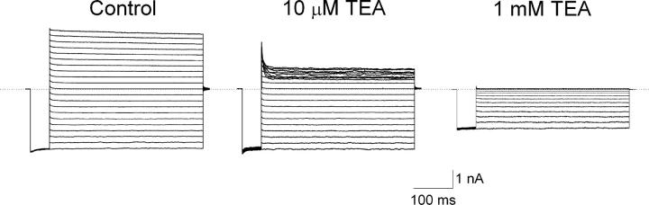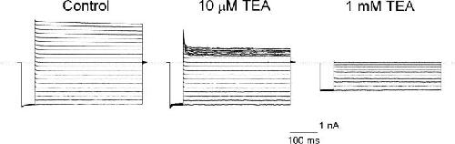 Figure 1. Inhibition of IRK1 currents by TEA. Current traces were recorded from a single patch in the absence (control) or presence of TEA at the concentrations indicated. Currents were elicited by stepping membrane voltage from the 0 mV holding potential to −100 mV and then to test voltages between −100 mV and +100 mV in 10-mV increments before returning it to the holding potential. Dotted line indicates the zero current level.