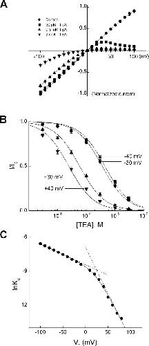 Figure 2. Voltage dependence of steady-state IRK1 block by TEA. (A) Averaged I-V curves (mean ± SEM; n = 6) determined at the end of test pulses in the absence (control) or presence of various concentrations of TEA. (B) The fraction of current not blocked is plotted against TEA concentration at the four representative voltages indicated. Curves through the data represent the equation I/Io = appKd/(appKd + [TEA]). (C) The natural logarithm of appKd is plotted against membrane voltage. The curve through the data is a fit of Eq. 1a, yielding K1 = 2.21 (±0.18) × 10−4 M and K2 = 4.65 ± 1.41 with valences Z1 = 0.47 ± 0.03 and Z2 = 1.61 ± 0.08 (mean ± SEM; n = 6). The dashed lines indicate the limiting slopes.