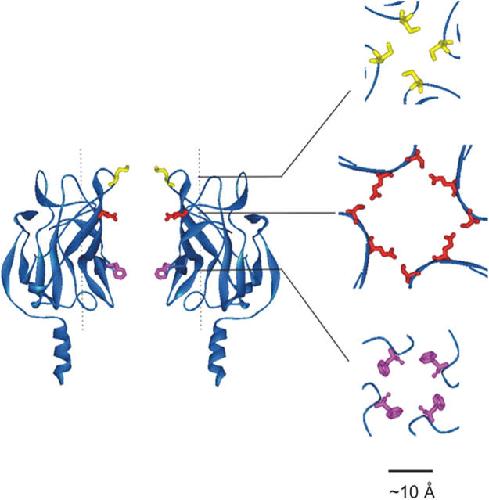 Figure 3. Crystal structure of cytoplasmic termini of GIRK1 (Nishida and MacKinnon, 2002). Shown on the left are two subunits of the cytoplasmic pore whose external end is on top. Side chains are highlighted for residues selenomethionine (Mse)308 (top, yellow), Ser225/Glu300 (middle, red), and Phe255 (bottom, pink), corresponding to Met307, Glu224/Glu299, and Phe254 in IRK1. Shown on the right are the center regions of cross sections through the tetrameric structure at the three levels indicated.