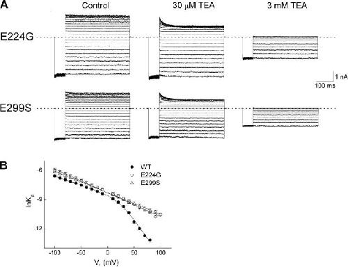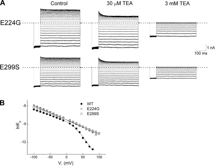 Figure 4. Effects of E224G or E299S mutations on voltage-dependent channel block by TEA. (A) Current traces for each type of mutant channel were recorded from a single patch in the absence (control) or presence of TEA at the concentrations indicated. Dotted lines indicate the zero current level. (B) The natural logarithm of appKd for the mutant channels (determined as shown in Fig. 2 B) is plotted against membrane voltage. The data for wild-type channels (taken from Fig. 2 C) are plotted here for comparison. The lines through the data for mutant channels are fits of a Boltzmann function. The fits yield appKd = 2.47 (±0.57) × 10−4 M and valence appZ = 0.63 ± 0.01 (mean ± SEM; n = 5) for E224G, and appKd = 2.51 (±0.56) × 10−4 M and valence appZ = 0.60 ± 0.04 for E299S (n = 5).