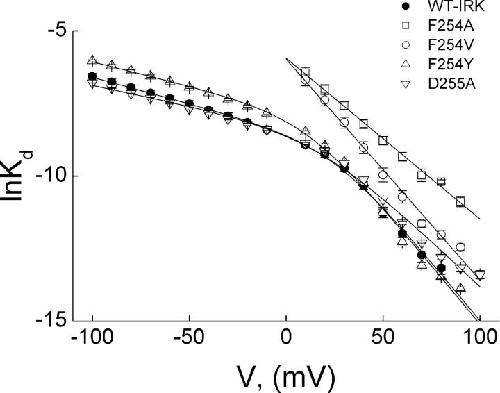 Figure 6. Voltage dependence of the apparent TEA affinity of channels with a mutation at F254 or D255. The natural logarithm of appKd for the mutant channels (determined as shown in Fig. 2 B) is plotted against membrane voltage. The data for wild-type channels (taken from Fig. 2 C) are plotted for comparison. The curves through the data for the F254Y and D255A mutant channels are fits of Eq. 1a, whereas lines through the data for F254A and F254V mutant channels are fits of a Boltzmann function (with parameters appKd and appZ). The fits yield K1 = 4.38 (±0.39) × 10−4 M and K2 = 2.05 ± 0.82 with valences Z1 = 0.43 ± 0.06 and Z2 = 1.64 ± 0.08 (n = 8) for F254Y; K1 = 2.55 (±0.25) × 10−4 M and K2 = 2.27 ± 1.07 with Z1 = 0.36 ± 0.07 and Z2 = 1.27 ± 0.08 (n = 3) for D255A; appKd = 2.64 (±0.20) × 10−3 M and valence appZ = 1.42 ± 0.03 (n = 5) for F254A; appKd = 2.54 (±0.41) × 10−3 M and appZ = 1.95 ± 0.07 (n = 6) for F254V.