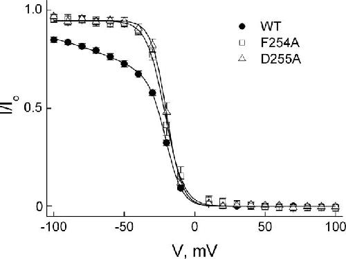 Figure 9. Voltage dependence of spermine inhibition of channels with and without a mutation at F254 or D255. The (averaged) fraction of current not blocked by 0.1 mM spermine is plotted against membrane voltage for wild-type and F254A and D255A mutant channels. The curve through the data for wild-type channels is a fit of Eq. 1; those for the mutant channels are fits of a Boltzmann function (with parameters appKd, appZ, and an offset of ∼5% to account for the shallow state with much reduced spermine affinity), yielding K1 = 1.30 (±0.06) × 10−4 M and K2 = 1.44 (±0.13) × 10−2 with valences Z1 = 0.40 ± 0.02 and Z2 = 4.23 ± 0.13 (mean ± SEM; n = 9) for wild type, appKd = 3.82 (±0.49) × 10−6 M and valence appZ = 3.96 ± 0.15 (n = 5) for F254A, and appKd = 2.45 (±0.28) × 10−6 M and appZ = 4.75 ± 0.14 (n = 8) for D255A.