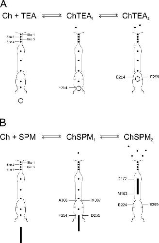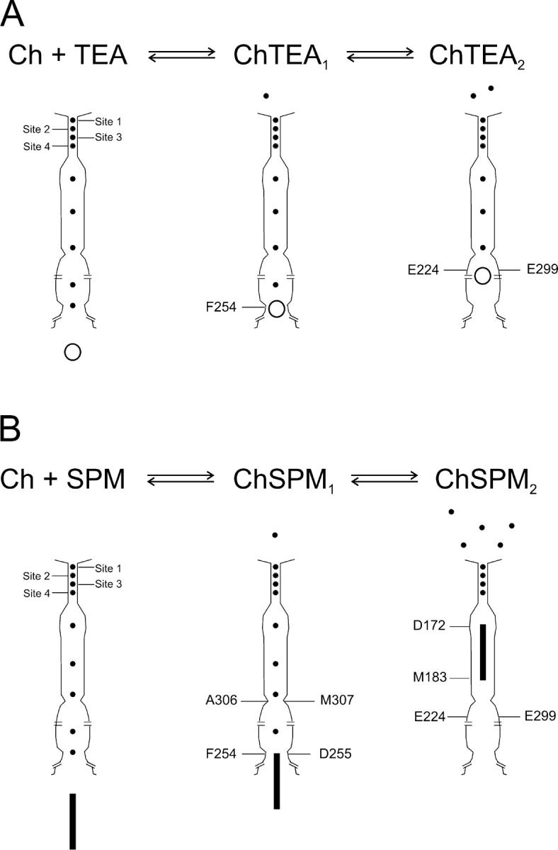 Figure 12. Models for TEA and spermine block of the IRK1 channel. Binding of a TEA (A) or spermine (SPM; B) molecule to a channel (Ch) produces two sequential blocked states (ChTEA1 and ChTEA2 or ChSPM1 and ChSPM2). K1 = [Ch][X]/[ChX1] and K2 = [ChX1]/[ChX2]. Except for the innermost one, K+ ions are positioned arbitrarily in the inner pore of the accompanying diagrams.