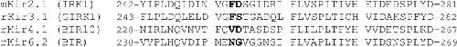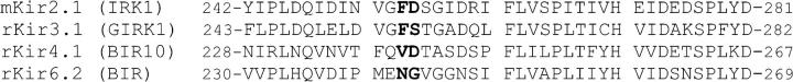 Figure 14. Comparison of a partial sequence among various Kir channels. Shown is partial sequence alignment among four different Kir channels. Bolded residues correspond to IRK1's F254 and D255.