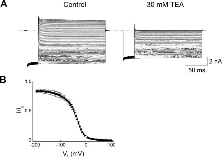 Figure 7. Inhibition of F254A mutant channels by a high concentration of TEA. (A) Current traces were recorded from a single patch in the absence (control) or presence of 30 mM TEA. Currents were elicited by stepping membrane voltage from the 0 mV holding potential to −200 mV and then to test voltages between −200 mV and +100 mV in 5-mV increments before returning it to the holding potential. Dotted line indicates the zero current level. (B) The (averaged) fraction of current not blocked by 30 mM TEA is plotted against membrane voltage between −200 and 100 mV. The curve though the data is a fit of a Boltzmann function (with an offset to account for the shallow state with much reduced spermine affinity), yielding appKd = 3.41 (±0.19) × 10−3 M and valence appZ = 1.34 ± 0.03 (mean ± SEM; n = 3).