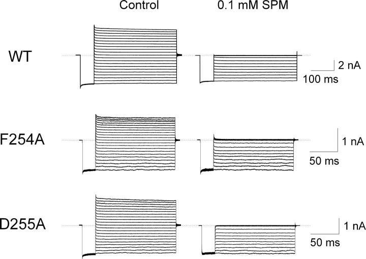 Figure 8. Inhibition by spermine of currents through channels with a mutation at F254 or D255. Current traces for wild-type and F254A and D255A mutant channels, each type recorded from a single patch in the absence (control) or presence of 0.1 mM spermine. During recordings, currents were elicited by stepping membrane voltage from the 0 mV holding potential to −100 mV and then to test voltages between −100 and +100 mV in 10-mV increments before returning it to the holding potential. Dotted lines indicate the zero current level.