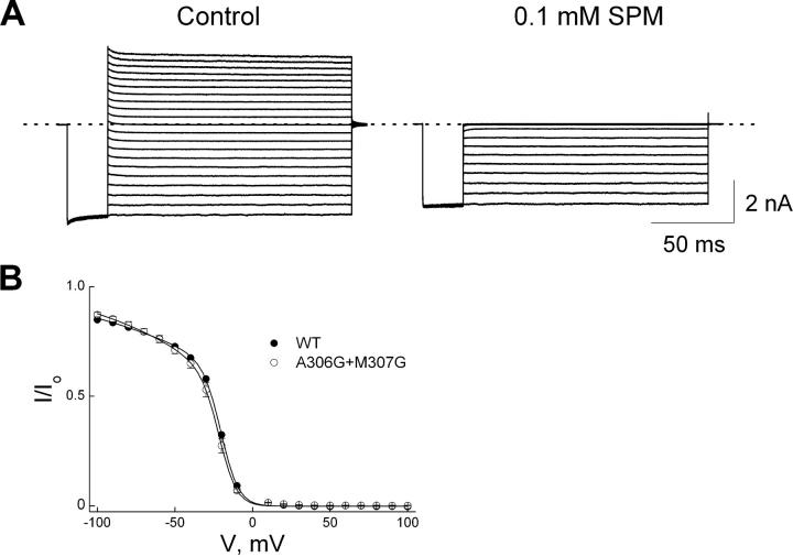 Figure 10. Inhibition of A306G-M307G double mutant channels by spermine. (A) Current traces recorded from a single patch in the absence (control) or presence of 0.1 mM spermine. (B) The (averaged) fraction of currents not blocked is plotted against membrane voltage for wild-type (taken from Fig. 9) and mutant channels. The curve through the mutant data is a fit of Eq. 1a, yielding K1 = 9.06 (±0.49) × 10−5 M and K2 = 1.45 (±0.16) × 10−2 with valences Z1 = 0.53 ± 0.02 and Z2 = 4.20 ± 0.16 (mean ± SEM; n = 5).