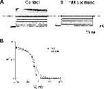 Figure 11. Inhibition of M183A mutant channels by spermine. (A) Current traces recorded from a single patch in the absence (control) or presence of 0.1 mM spermine. (B) The (averaged) fraction of currents not blocked is plotted against membrane voltage for wild-type (taken from Fig. 9) and mutant channels. The curve though the mutant data is a fit of Eq. 1a, yielding K1 = 2.11 (±0.39) × 10−4 M and K2 = 9.31 (±1.84) × 10−2 with valences Z1 = 0.21 ± 0.06 and Z2 = 2.20 ± 0.14 (mean ± SEM; n = 6).