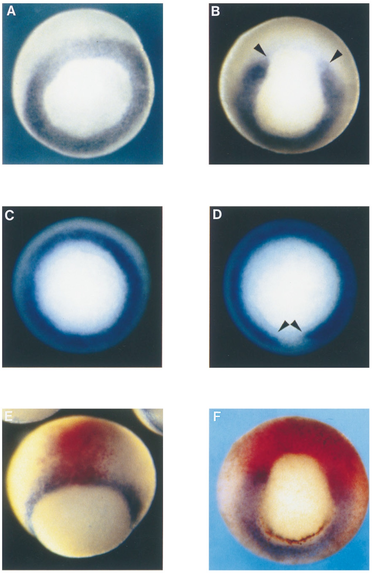 FIG. 6. Overexpression of dnxnf7 affects the expression of the pan-mesodermal marker Xbra. In situ hybridization analysis of embryos injected with wild-type xnf7-8 in the dorsal (A) or ventral (C) blastomeres showing Xbra expression at stage 10.5. Xbra expression was also analyzed in embryos injected with dnxnf7 in the future dorsal region (B) and in the future ventral region (D). In addition, we also immunostained embryos using an alkaline phosphatase-conjugated anti-T7 Tag antibody (E and F, red color). (E) Immunostaining of the embryos injected in dorsal blastomeres with wild-type xnf7-8. (F) Embryo injected with dnxnf7 in the dorsal blastomeres. Dorsal side of embryos is up and arrows point to the gap in Xbra expression.