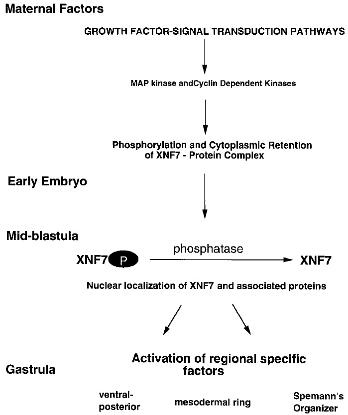FIG. 9. Summary of the role of xnf7 in D/V patterning. xnf7 is phosphorylated during oocyte maturation by several different kinases at two sites. This results in its retention in the cytoplasm in a 670-kDa complex (Shou et al., 1996). It remains cytoplasmic until the MBT when it is dephosphorylated and enters the nucleus. We speculate that other components interact with xnf7 in nuclei within different regions of the embryo, resulting in the regulation of genes giving mesoderm a dorsal/ventral character. xnf7 probably functions in parallel with other mesodermal regulatory pathways.