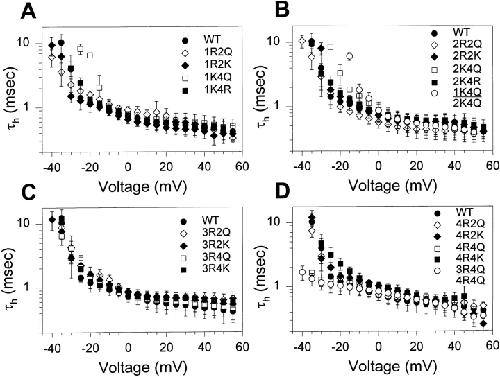 Figure 2. Effects of S4 mutations on the voltage dependence of fast inactivation time constants. Time constants (τh) of fast inactivation were determined for all of the mutants as described in materials and methods. The time constants are plotted on a log scale versus voltage for the mutants in domains I (A), II (B), III (C), and IV (D). Data for the double mutants are shown in B and D. The data points represent the means of at least three determinations and the error bars show the standard deviations.